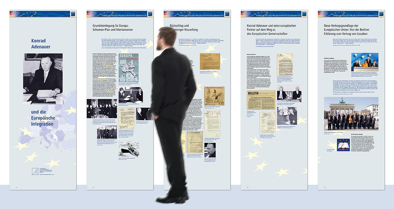 Die Ausstellung „Konrad Adenauer und die Europäische Integration“ zeigt den Erfolg der wirtschaftlichen Integration mit der Gründung der Montanunion und der Unterzeichnung der Römischen Verträge zur Zeit Adenauers. Zusammen mit anderen Gründervätern legte Adenauers Politik den Grundstein für die Vertiefung und die anschließende Ereiterung der Gemeinschaft hin zur Europäischen Union. Auch diese Entwicklung bis zum Vertrag von Lissabon ist Teil der Ausstellung, die aus insgesamt aus 9 Rollup-Tafeln besteht und für max. 14 Tage ausgeliehen werden kann. Für Schulen ist sie ab der 9. Klasse zu empfehlen.