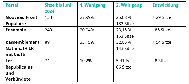 Die republikanische Front oder Brandmauer darf jedoch nicht darüber hinwegtäuschen, dass es auch das französische Wahlsystem (Mehrheitswahlrecht) ist, dass den Rechtsruck Frankreichs ausbremsen konnte. Marine Le Pen spricht deshalb nun bewusst, von einem „geklauten Wahl“. Sie wird dieses Argument in den kommenden Wochen gezielt anwenden. Für Le Pen stellte RN in der Nationalversammlung die größte Partei. Sie verweist darauf, dass die guten Ergebnisse von NFP und Ensemble sich auf eine Blockbildung stützen, die sich jeweils auf vier und mehr Parteien stützt, wohingegen RN, abgesehen von einigen Kandidaten der Républicains mit Ciotti eine hohe Sitzanzahl ohne Bündnisbildung erhielt.