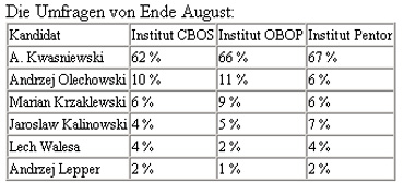 Der Präsidentschaftswahlkampf für den 8. Oktober geht in der zweiten Septemberwoche in seine heiße Phase. Bisher zeigen alle Umfragen einen bemerkenswert stabilen, haushohen Vorsprung des Amtsinhabers Aleksander Kwasniewski.