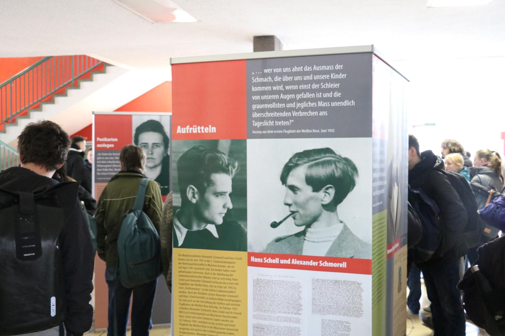 Im Anschluss an das eindrückliche Gespräch bekamen die Schülerinnen und Schüler die Möglichkeit die Wanderausstellung „Was konnten sie tun?“ zu besuchen. Professor von Steinau-Steinbrück war weiterhin gefragter Gesprächspartner und konnte Fragen zur Ausstellung beantworten. Die Wanderausstellung klärt über Art und Weise des Widerstandes auf und zeigt wie vielfältig dieser war: Formen des Widerstandes reichten vom Verteilen von Flugblättern über Wehrdienstverweigerung bis zum Anschlag auf den Kopf des Nationalsozialismus Adolf Hitler.