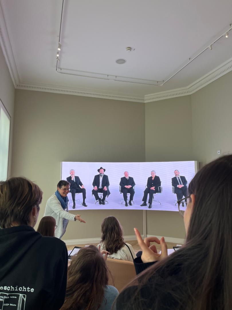 Das zweite Obergeschoss „Tradition und Ritual“ widmete sich den Veränderungen und den verschiedenen Strömungen des jüdischen Glaubens. Insbesondere die digitale Fragerunde mit Rabbinerinnen und Rabbinern aus Frankfurt stieß auf großes Interesse bei den Schülerinnen und Schülern. Im letzten Teil der Führung lag der zeitliche Fokus auf der Nachkriegsgeschichte bis zur Gegenwart. Hierbei wurden die Folgen des Nationalsozialismus anhand ausgewählter persönlicher Biografien thematisiert und die Mitwirkung von Jüdinnen und Juden in Frankfurt nach der Nachkriegszeit beleuchtet.