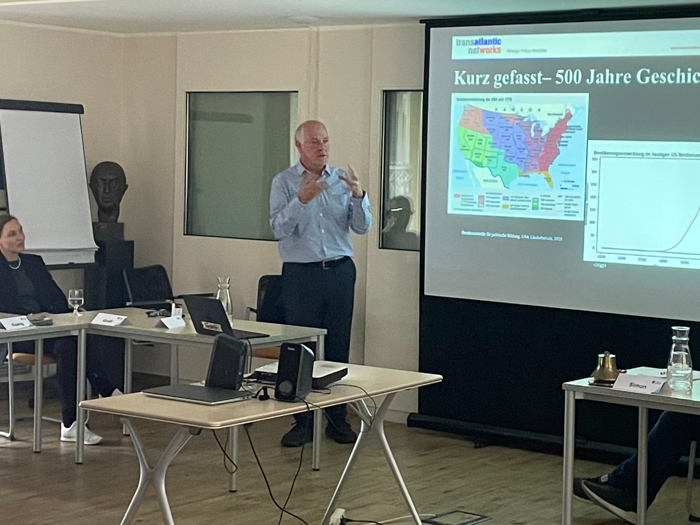 Am Dienstag eröffnete Prof. Groitl die Tagung und betonte, dass wir Europäer den USA ähnlicher seien, als wir glaubten. Es stelle sich die Frage, wie man eine entgrenzte globalisierte Welt in einer national aufgeteilten Welt handhaben könne. Erst die Führungsbereitschaft der USA hätten in der Vergangenheit Europa handlungsfähig gemacht. Sie empfahl mehr Gelassenheit in Bezug auf die USA. Es gebe eine Konstante in der Politik der USA, die da laute: Zusammen mit den Partnern gegen Autokratien, wenn möglich, aber auch allein, wenn notwendig. Europa müsse endlich Ziele definieren und „Muskeln aufbauen“ zu deren Durchsetzung. Schließlich gebe es gegenüber dem Staat die Anspruchshaltung, wehrhaft nach außen und freiheitlich nach innen zu sein. Dazu stelle sich die Frage nach der Führungsrolle in Europa, die nur kollektiv beantwortet werden könne.