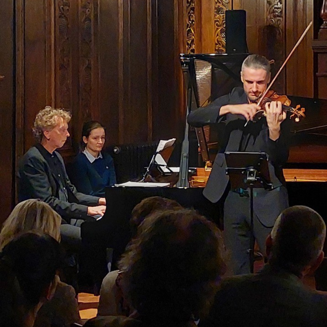 Begleitet wurden die Erzählungen durch die Aufführung ursprünglich verschollener Noten der dieser jüdischen Musiker, welche in der Villa Seligmann mit zum ersten Mal seit ihrer Niederschrift der Öffentlichkeit vorgespielt wurden. Johannes Fleischmann und Justus Zeyen beeindruckten mit ihrer Darbietung im kleinsten Format der Kammermusik – der Besetzung Violine und Klavier. Die Auswahl der Stücke spiegelte die vielfältigen Strömungen und Faszinationen der Musikgeschichte dieser Epoche wider. Eine Musik mit vielen „jüdischen“ aber auch „fernöstlichen“ Klängen, welche die Biografien ihrer Schöpfer widerspiegelte und ihnen so wieder ein Gesicht gab. Die Musik schaffte es gemeinsam mit den biografischen Erzählungen, die Emotionen und Schicksale der Exilanten wieder lebendig werden zu lassen und ergriff die Teilnehmerinnen und Teilnehmer sichtlich.