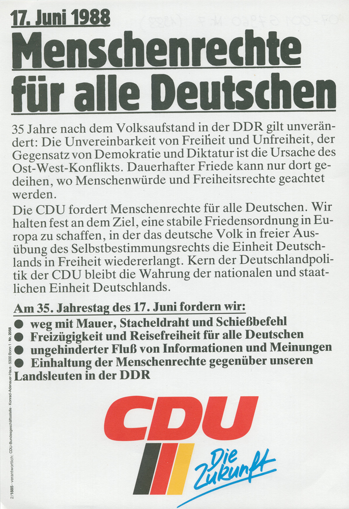 Flugblatt der CDU zum 35. Jahrestag des Volksaufstandes in der DDRFlugblatt der CDU kurz vor dem Mauerfall
