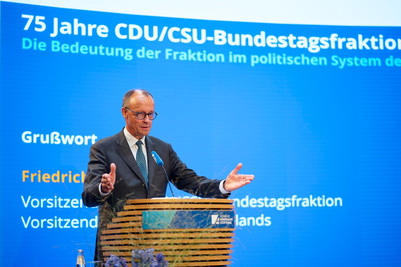 Diese Prägung bestätigte der CDU-Bundesvorsitzende Friedrich Merz im anschließenden Grußwort: „Die Geschichte unserer Fraktion ist untrennbar mit der Geschichte der Bundesrepublik verbunden“. Merz erinnerte an die Zeit der Bonner Republik, an die ersten Jahre, in denen „Demokratie gelernt, verbessert und verfeinert“ wurde, an die Zeit im gesamtdeutschen Bundestag seit Oktober 1990 sowie an die anhaltende, gute Zusammenarbeit von CDU und CSU: „Auch heute erwächst die Stärke unserer Fraktion aus der Einheit unserer beiden Schwesterparteien.“ Merz dankte dafür seinem Fraktionskollegen, dem Vorsitzenden der CSU im Deutschen Bundestag, Alexander Dobrindt. Dieser erwiderte in seinem Grußwort diesen Dank und verwies wiederum darauf, dass Sicherheit und Stabilität schließlich der Markenkern der Unionsparteien seien und es bei den Themen, die die Bundesrepublik und ihre Geschichte prägen, große Übereinstimmung gebe, darunter die Wiederbewaffnung, die Westbindung, die Soziale Marktwirtschaft und die europäische Einigung. Es herrsche tatsächlich, so Dobrindt, eine „pragmatische Harmonie“, wie Franz Josef Strauß es genannt hatte.