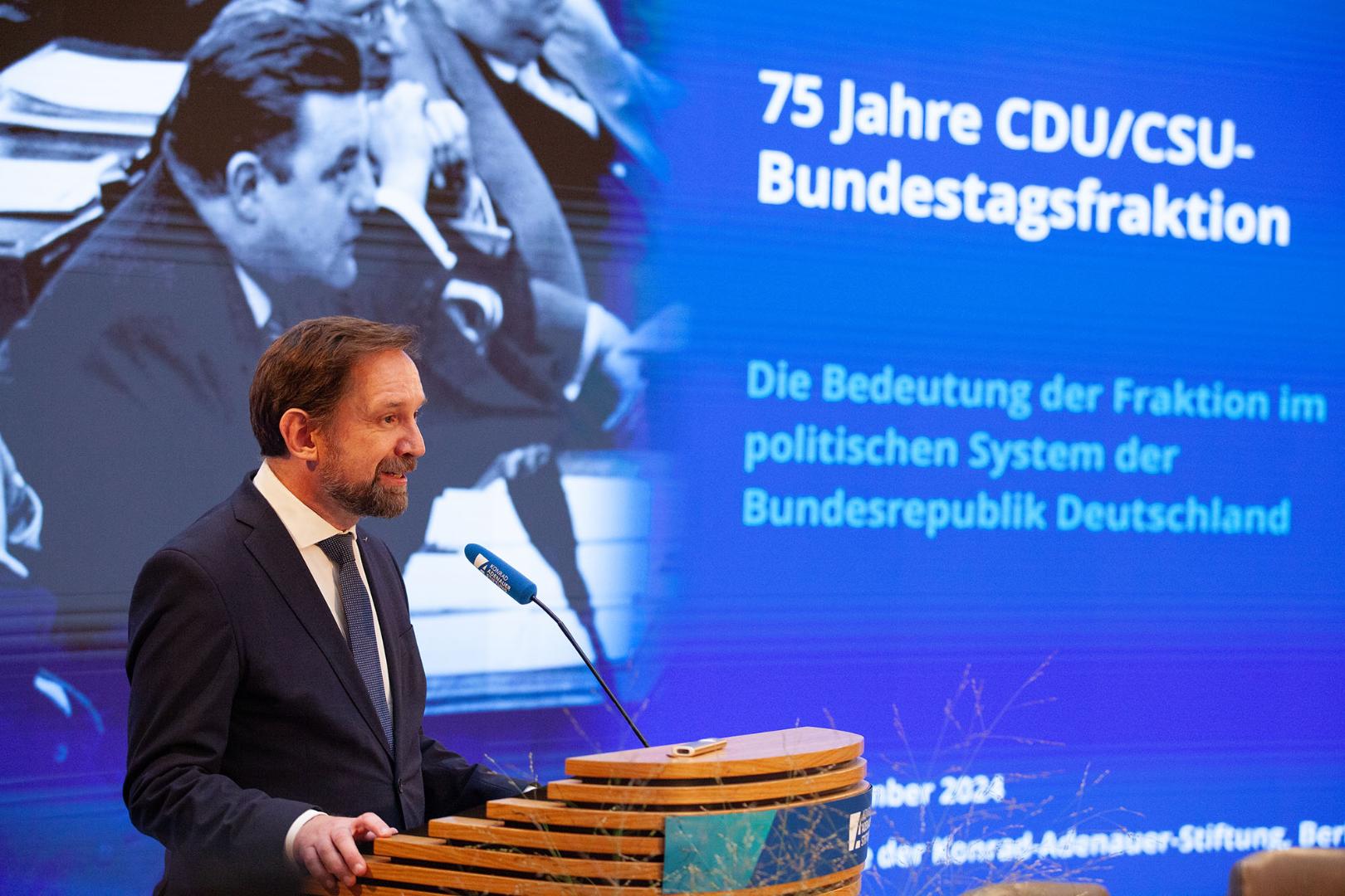 Neben der Verkündung des Grundgesetzes im Mai und der Wahl zum ersten Deutschen Bundestag im August 1949 erwiesen sich in der Zeit des demokratischen Aufbruchs nach dem Ende des Zweiten Weltkriegs zwei weitere Ereignisse als entscheidend für die weitere Geschichte der Bundesrepublik, Entwicklungen, die der Vorsitzende der Konrad-Adenauer-Stiftung, Bundestagspräsident a.D. Prof. Dr. Norbert Lammert, in seiner Einführung eine „doppelte Innovation“ nannte: „Die Gründung zweier neuer Schwesterparteien, die sich nicht nur unter dem Namen als Volkspartei neuen Typs verstanden haben, und die folgerichtige Bildung einer gemeinsamen Fraktion, die 75 Jahre deutschen Parlamentarismus nachhaltig geprägt haben.“