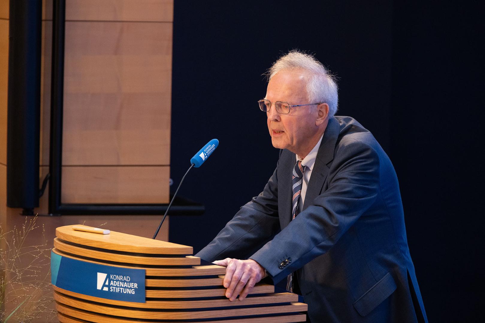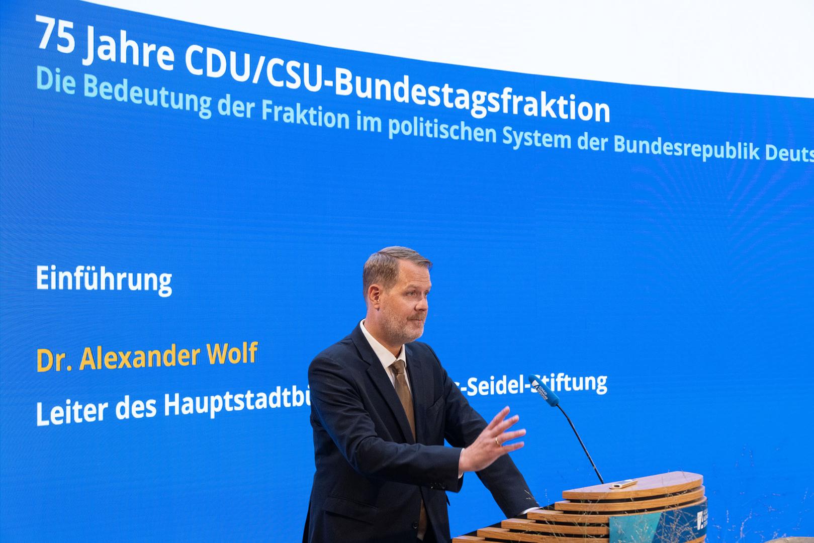 Der politischen Diskussionsrunde ging ein umfassendes wissenschaftliches Symposium am Nachmittag voraus, bei dem die Teilnehmer und Teilnehmerinnen von Dr. Alexander Wolf, dem Leiter des Hauptstadtbüros der Hanns-Seidel-Stiftung, und Dr. Michael Borchard, dem Leiter der Hauptabteilung Wissenschaftliche Dienste / Archiv für Christlich-Demokratische Politik, begrüßt wurden. Prof. Dr. Horst Möller (München), würdigte in seinem einleitenden Vortrag die Zusammenarbeit von CDU und CSU im Deutschen Bundestag und den Beitrag der CDU/CSU-Fraktion zum Aufbau der deutschen Demokratie nach dem Zweiten Weltkrieg. Ohne die Kooperation der beiden Parteien sei die Wahl Adenauers zum ersten Bundeskanzler nicht möglich gewesen, so Möller. Insofern verdankten sich auch wesentliche politische Grundsatzentscheidungen – die Westbindung, die Einführung der Sozialen Marktwirtschaft und die Europäische Einigung – dem Miteinander der C-Parteien. Natürlich habe es in den 75 Jahren der Zusammenarbeit auch spannungsreiche Phasen gegeben, so Möller, man denke an den Kreuther Trennungsbeschluss von 1976 oder die Migrationskrise 2015/2016. Dennoch funktioniert die Zusammenarbeit auch aus der Sicht des Geschichtswissenschaftlers „überwiegend reibungslos und effizient“, und zwar auch aufgrund der „Integrationsleistung der beiden Vorsitzenden“. Schließlich benötigen beide Partner einander, so Möller: „Ohne CSU könnte die CDU schwerer einen Kanzler stellen, ohne CDU hätte die CSU in der Bundespolitik weniger Bedeutung.“