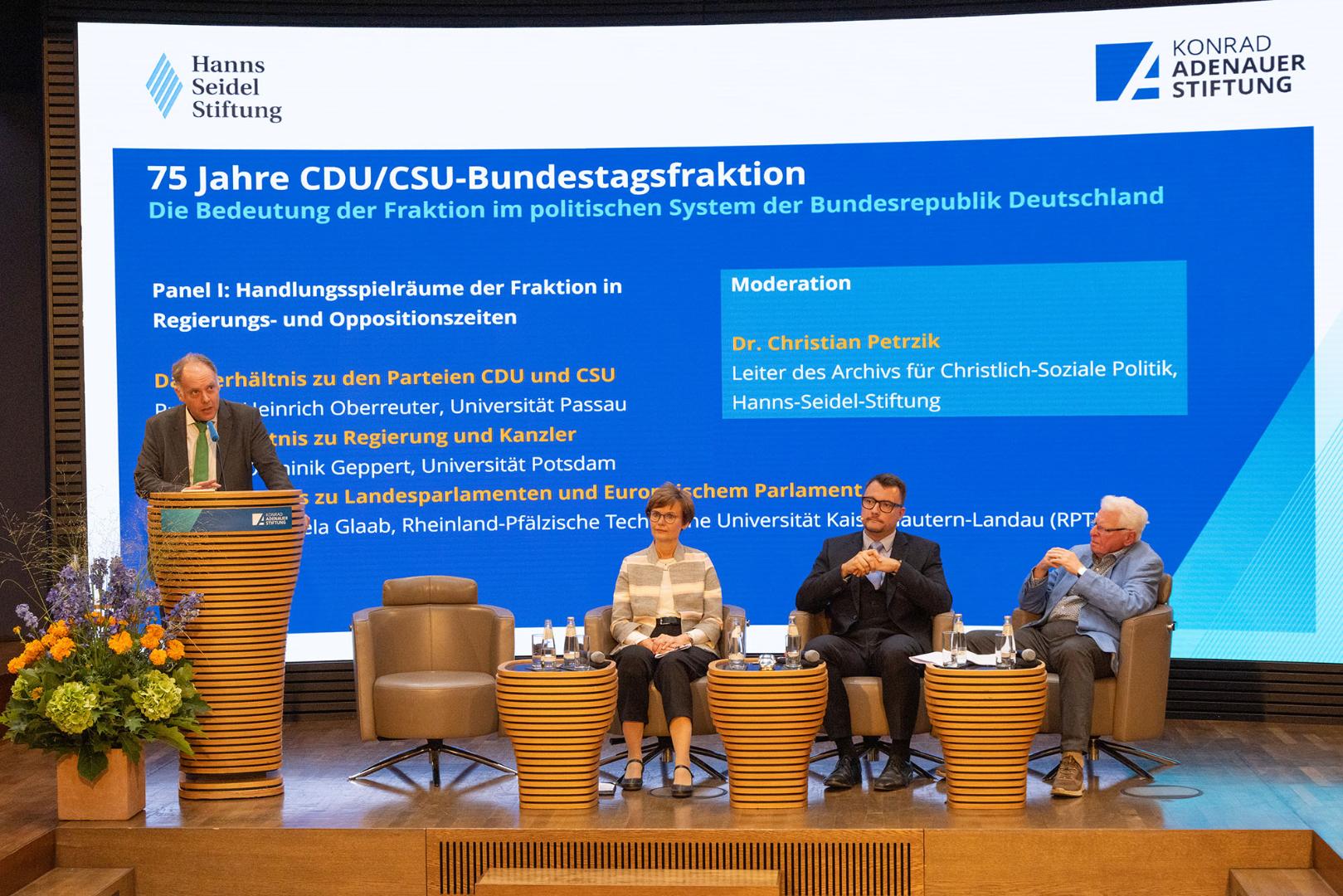 Im ersten Panel der Tagung referierten Prof. Dr. Heinrich Oberreuter (Passau), Prof. Dr. Dominik Geppert (Potsdam) sowie Prof. Dr. Manuela Glaab (Kaiserslautern-Landau) unter der Moderation von Dr. Christian Petrzik vom Archiv für Christlich-Soziale Politik in München. Sie beschäftigten sich mit den Handlungsspielräumen der Fraktion im politischen System der Bundesrepublik. Zur Sprache kamen hierbei die rechtlichen Voraussetzungen der Fraktionsarbeit und die Rolle der Fraktion bei der Kür von Kanzlerkandidaten und der Rekrutierung von Regierungsmitgliedern (Geppert), die wechselnde Bedeutung der Fraktion für die Stellung der Parteien insgesamt, denn bis zum Ende der Regierungszeit Adenauers existierte noch kein voll ausgebauter Parteiapparat der CDU (Oberreuter). Manuela Glaab wies auf die Europäisierung des Regierungssystems in den vergangenen beiden Jahrzehnten hin. Hiermit einher ging, so ihre These, eine stetige Aufwertung der Exekutive. Was die Rolle der Fraktion anbelangt, sei seit der Einführung der Direktwahlen zum Europäischen Parlament 1979 und dem Ausschluss von Doppelmandaten 2006 ein neues konkurrierendes Pendant zur Bundestagsfraktion auf europäischer Ebene entstanden.