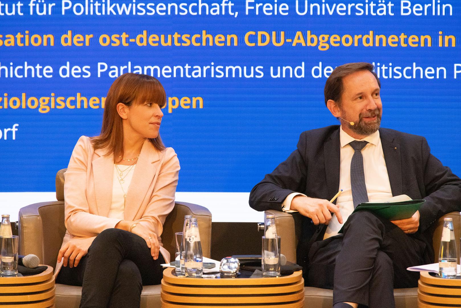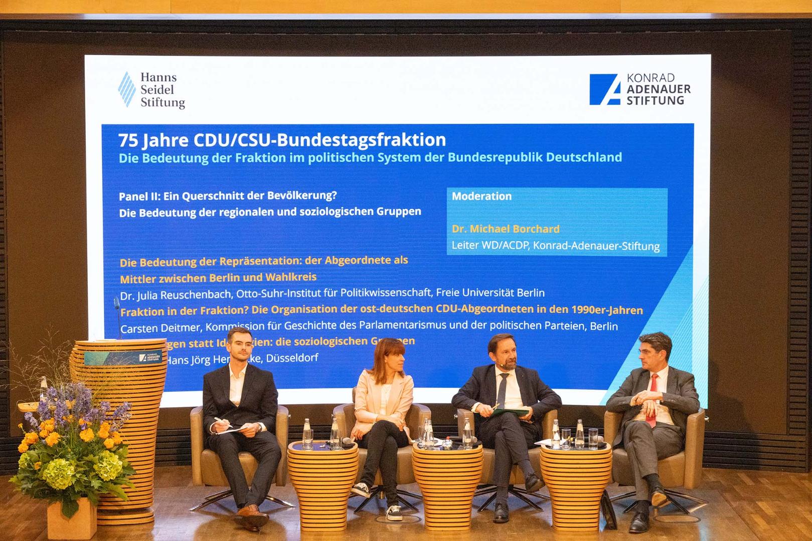 Dr. Julia Reuschenbach (Berlin), Carsten Deitmer (Berlin) und Prof. Dr. Hans-Jörg Hennecke (Düsseldorf) bestritten zusammen mit Dr. Michael Borchard als Moderator das zweite wissenschaftliche Panel zum Thema „Ein Querschnitt der Bevölkerung? Die Bedeutung der regionalen und soziologischen Gruppen“. Reuschenbach zitierte politikwissenschaftliche Studien, die nahe legen, dass Teile der Bevölkerung im Parlament unterrepräsentiert sind. In der anschließenden Diskussion blieb offen, welche Schlüsse aus diesem Befund zu ziehen sind. Aus dem Publikum erfolgte der Hinweis auf Artikel 38 GG, der besagt, dass die Abgeordneten des Deutschen Bundestags Vertreter des ganzen Volkes sind, an Aufträge und Weisungen nicht gebunden und nur ihrem Gewissen unterworfen. Diese Verfassungsnorm widerspreche, so ein Argument, der in jüngster Zeit verschiedentlich vorgetragenen Forderung nach einer nach Gruppen und Identitäten festzulegenden Wahlordnung. Auch Hans-Jörg Hennecke betonte, dass die Abgeordneten jeweils verschiedene Identitäten repräsentierten, zum Beispiel als Vertreter einer bestimmten Berufsgruppe, einer Religion, oder einer Region. Die „überlappenden Lebenslagen“ spiegelten sich in den soziologischen Gruppen der CDU/CSU-Fraktion. Carsten Deitmer berichtete von den Ergebnissen seiner Dissertation über die ostdeutschen CDU-Abgeordneten im Deutschen Bundestag in den 1990er Jahren. Er sprach von der „Entstehung einer systemstabilisierenden christdemokratischen Funktionselite“, wobei in den neuen Ländern ein „unterentwickelter vorpolitischen Raum“ zu beobachten sei.