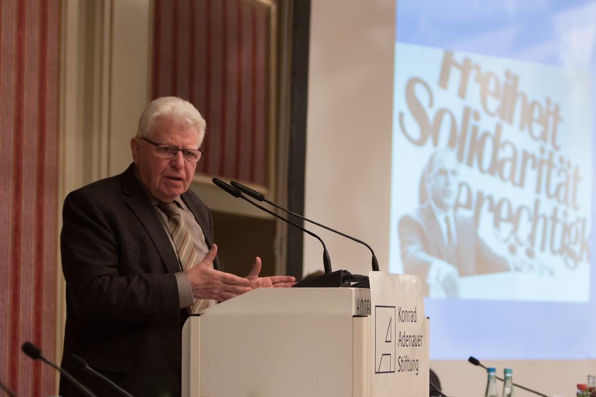 Die Frage, ob „1968“ als Geburtsstunde der modernen CDU gelten könne, beantwortete Prof. Dr. Heinrich Oberreuter, emeritierter Ordinarius für Politikwissenschaft an der Universität Passau, mit einem klaren „Nein!“. Schon die Gründung der CDU war eine moderne, wegweisende Idee. Als überkonfessionelle, alle Schichten umfassende Partei gab ihre Gründung den „Startschuss“ für die Etablierung der Volksparteien. So ermöglichte die CDU die Stabilisierung des Parteiensystems und besiegelte damit auch den Strukturbruch zur Weimarer Republik. Ob Soziale Marktwirtschaft, Westbindung und Europäisierung oder der daraus folgende Abschied vom Nationalismus – die CDU brach in zentralen Bereichen mit überkommenen Denkstrukturen. Zudem war sie auch in der Ära Adenauer keine programmlose Partei, vielmehr drückten sich ihre Standpunkte im Regierungshandeln aus. Das zum Ende der Ära Adenauer zunehmende Bedürfnis nach inhaltlicher und organisatorischer Erneuerung sei, so Oberreuter, indessen mit dem Zeitgeist dieser Jahre zusammengefallen.