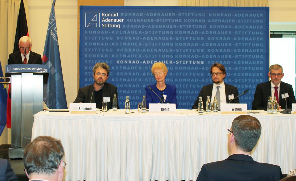 Diese Rolle des Gerichtshofes, das Unionsrecht in allen 28 Mitgliedsstaaten zu wahren und gleichzeitig seine Rückbindung an die individuellen Verfassungen der Mitgliedsstaaten zu gewährleisten, war Kern der Diskussion des ersten Panels, auf dem mit Prof. Dr. Dr. h.c. Thomas von Danwitz, Kammerpräsident am Europäischen Gerichtshof und Prof. Dr. Doris König, M.C.L., Richterin am Bundesverfassungsgericht, zwei hochkarätige Vertreter der europäischen und deutschen Gerichtsbarkeit sowie mit Maximilian Steinbeis, Gründer und Herausgeber des Verfassungblogs, ein wichtiger Vertreter des Diskurses vertreten waren.