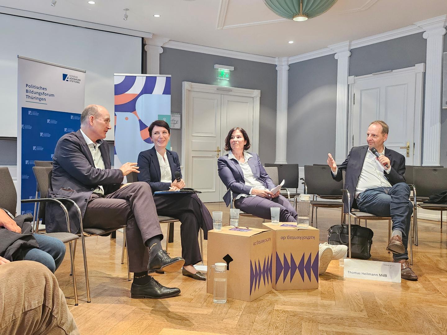 „Man muss Wirtschaft und Nachhaltigkeit zusammen denken. Aber im Rahmen eines Marathons, nicht Sprints“, betonte die Thüringer Unternehmerin Boos-John. Nur dann könne die Wirtschaft nach wie vor wachsen und sozial bleiben. Bundestagsabgeordneter Heilmann sieht das ähnlich: „Die Dinge bedingen sich. Die Finanzierung klimapolitischer Maßnahmen geht nur über eine florierende Marktwirtschaft.“ Verleger Manuel Herder ergänzte, dass eine verbindliche Öko-Bilanz ein wichtiges Element in einer ökologisch-sozialen Marktwirtschaft sei. „Es braucht verbindliche Regeln und Einigkeit“, betonte er.