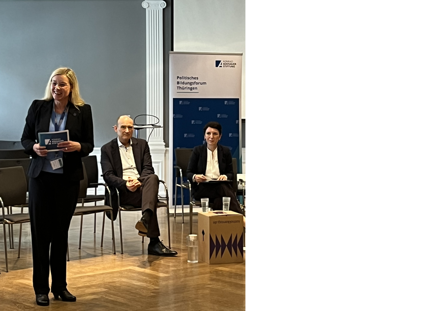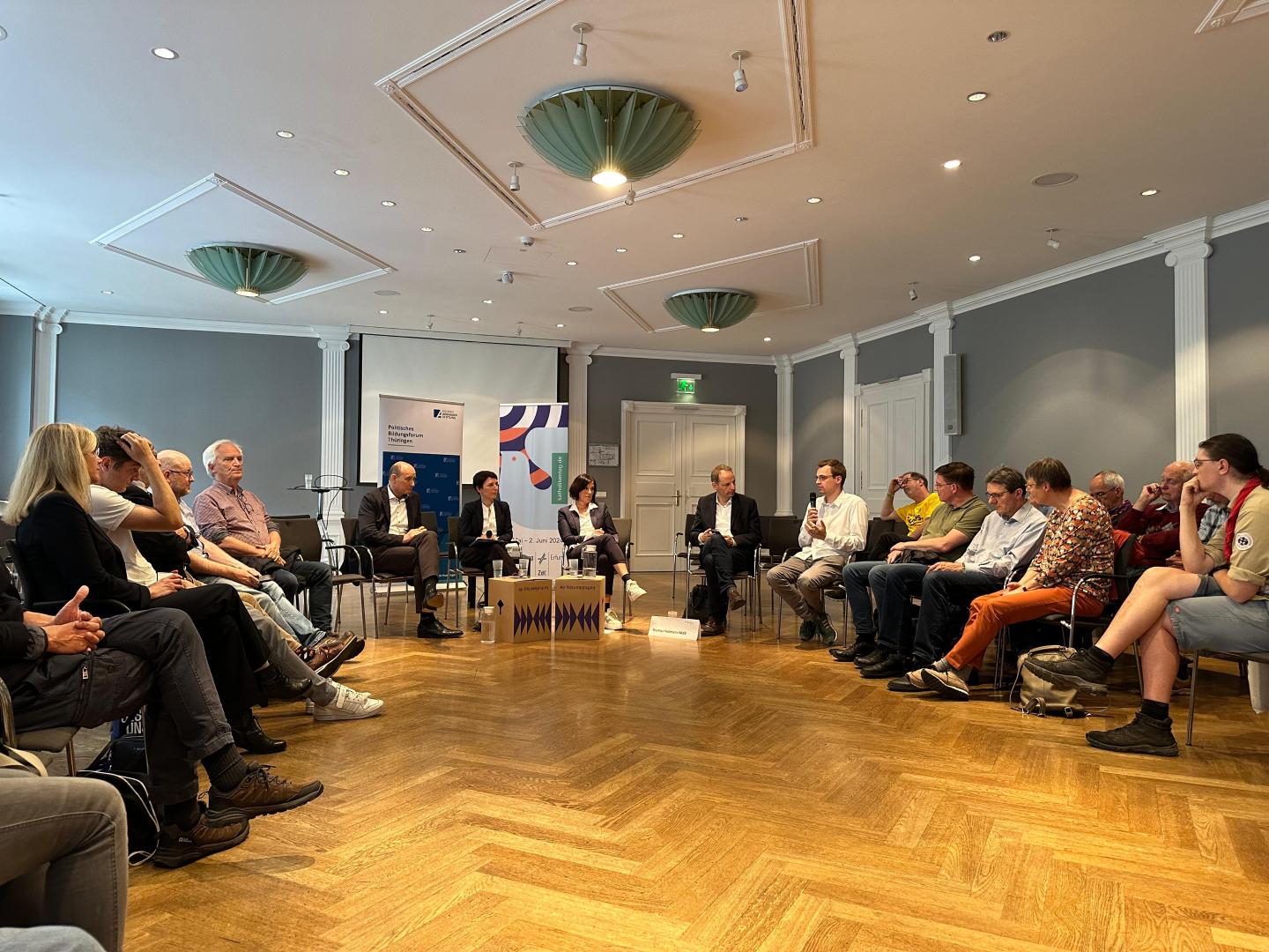„Es ist mir eine Freude so vielen Christinnen und Christen hier heute in Erfurt zu begegnen“, mit diesen Worten begrüßte Maja Eib, Landesbeauftragte und Leiterin des Politischen Bildungsforums Thüringen, die rund 50 Teilnehmenden. Die Moderation der Veranstaltung übernahm Patricia Ehret, Referentin für Kirchen und Religionsgemeinschaften. Diskussionsimpulse gab unter anderem Colette Boos-John. Sie ist Geschäftsführerin der Bauer Bauunternehmen GmbH, Vorsitzende der Familienunternehmer e.V. LV Thüringen sowie Vizepräsidentin der IHK-Erfurt. Auch Verleger Manuel Herder teilte seine Erfahrungen und Gedanken. Er leitet den Freiburger Herder Verlag in sechster Generation. Für den politischen Teil der Runde sorgte der CDU-Bundestagsabgeordnete Thomas Heilmann. Er ist Mitglied im Ausschuss für Klimaschutz und Energie sowie Vorsitzender der KlimaUnion. „Heute laden wir aber auch Sie alle ein, mitzudiskutieren und in unser Aquarium zuschwimmen“, erklärte Moderatorin Ehret den Teilnehmenden.