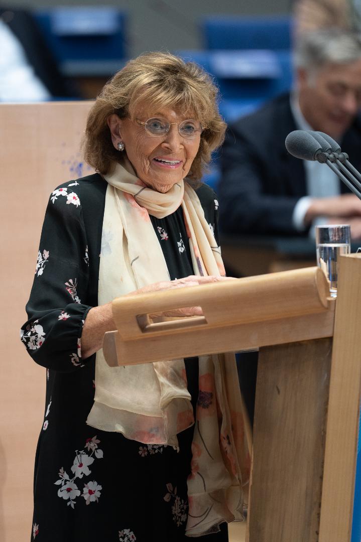 Der deutsche Staat, seine Repräsentanten, überhaupt die gesamte offizielle Kommunikation stehen unverändert hinter der Jüdischen Gemeinde in Deutschland – aber auch die deutsche Gesellschaft? Da seien Zweifel unabweisbar. Charlotte Knobloch, ehemalige Präsidentin des Zentralrats der Juden, teilt diese Zweifel und hielt eine nachdenkliche, ja eine mahnende Rede. Sie gab zunächst einen Rückblick darauf, was die 31 Jahre deutsche Vereinigung, die heute zu feiern sind, für die Jüdische Gemeinde bedeutet haben, indem sie das Wort von der „Jüdischen Wiedervereinigung“ gebrauchte. Wiedervereinigt werden mussten nämlich nicht nur die ca. 30.000 westdeutschen mit den zuwandernden Jüdinnen und Juden aus den GUS-Staaten, sondern auch die westdeutschen Gemeinden mit den jüdischen Gemeinderudimenten in der ehemaligen DDR, deren antireligiöse Politik und offener Antizionismus die Zahl der in der DDR lebenden Menschen jüdischen Glaubens auf unter 1000 gedrückt hatte.