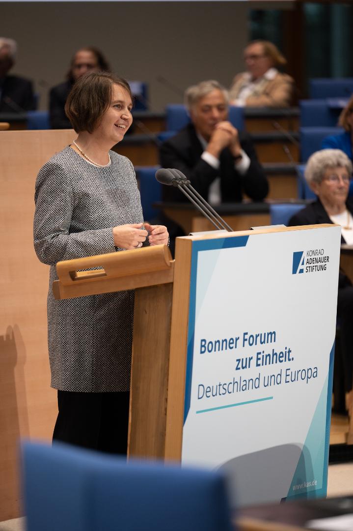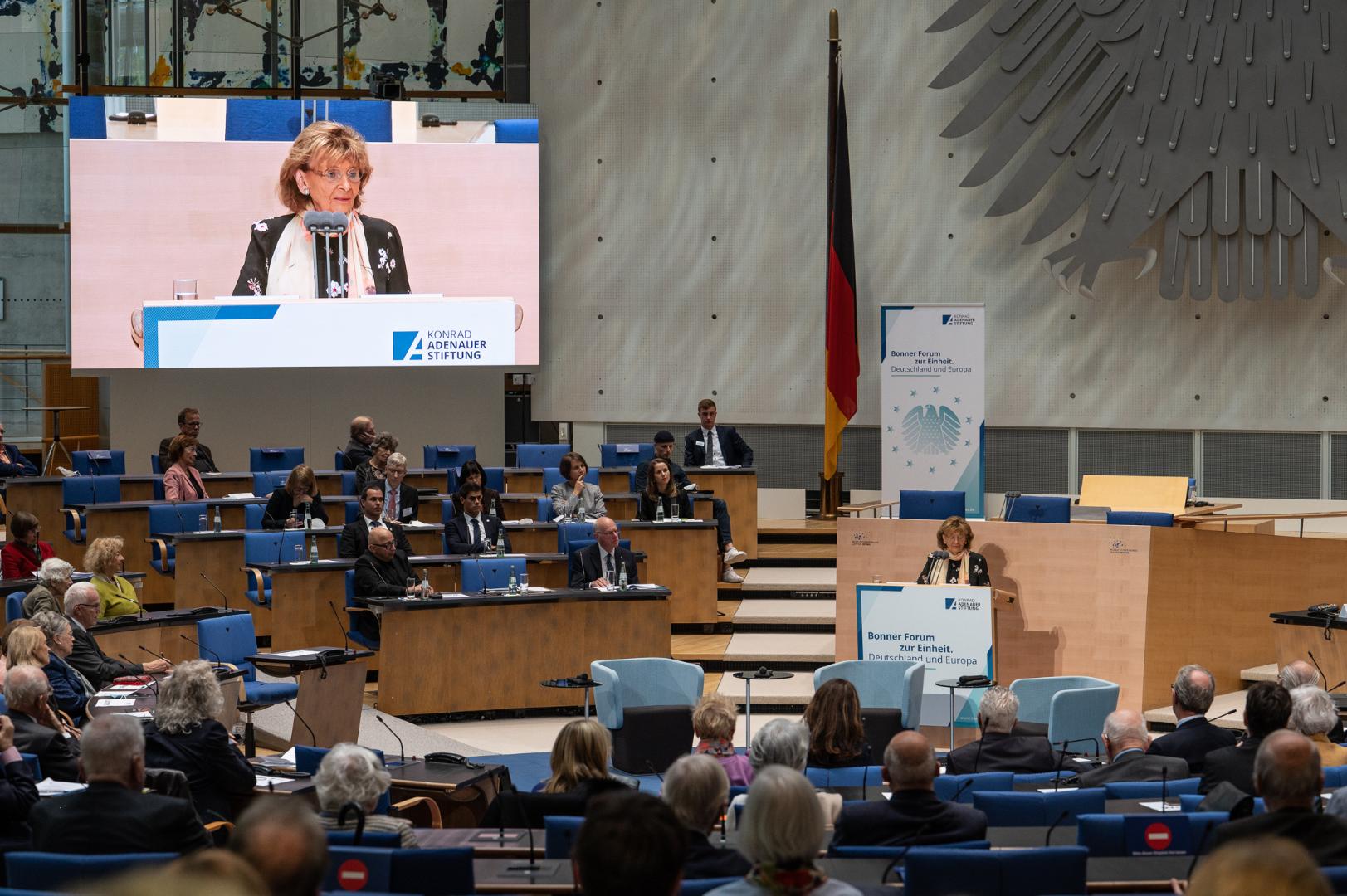 An dieser Stelle - so berichtete Prof. Dr. Norbert Lammert, Bundestagspräsident a.D. und Vorsitzender der Konrad-Adenauer-Stiftung, in seiner Einführung zu Beginn des diesjährigen „Bonner Forum zur Einheit“ im ehemaligen Plenarsaal des Deutschen Bundestages im WCCB - wurde kurz vor dem Umzug des Deutschen Bundestages ins Reichstagsgebäude der Bau des Holocaustmahnmals in Berlin beschlossen. Unter anderem damit trat die damals noch keine 10 Jahre vereinigte Bundesrepublik den Befürchtungen aus dem Ausland entgegen, das gemeinsam entstehende Deutschland könnte einen Rückfall in nationalistisches Denken und eine Sehnsucht nach dem „Schlussstrich“ erleben.