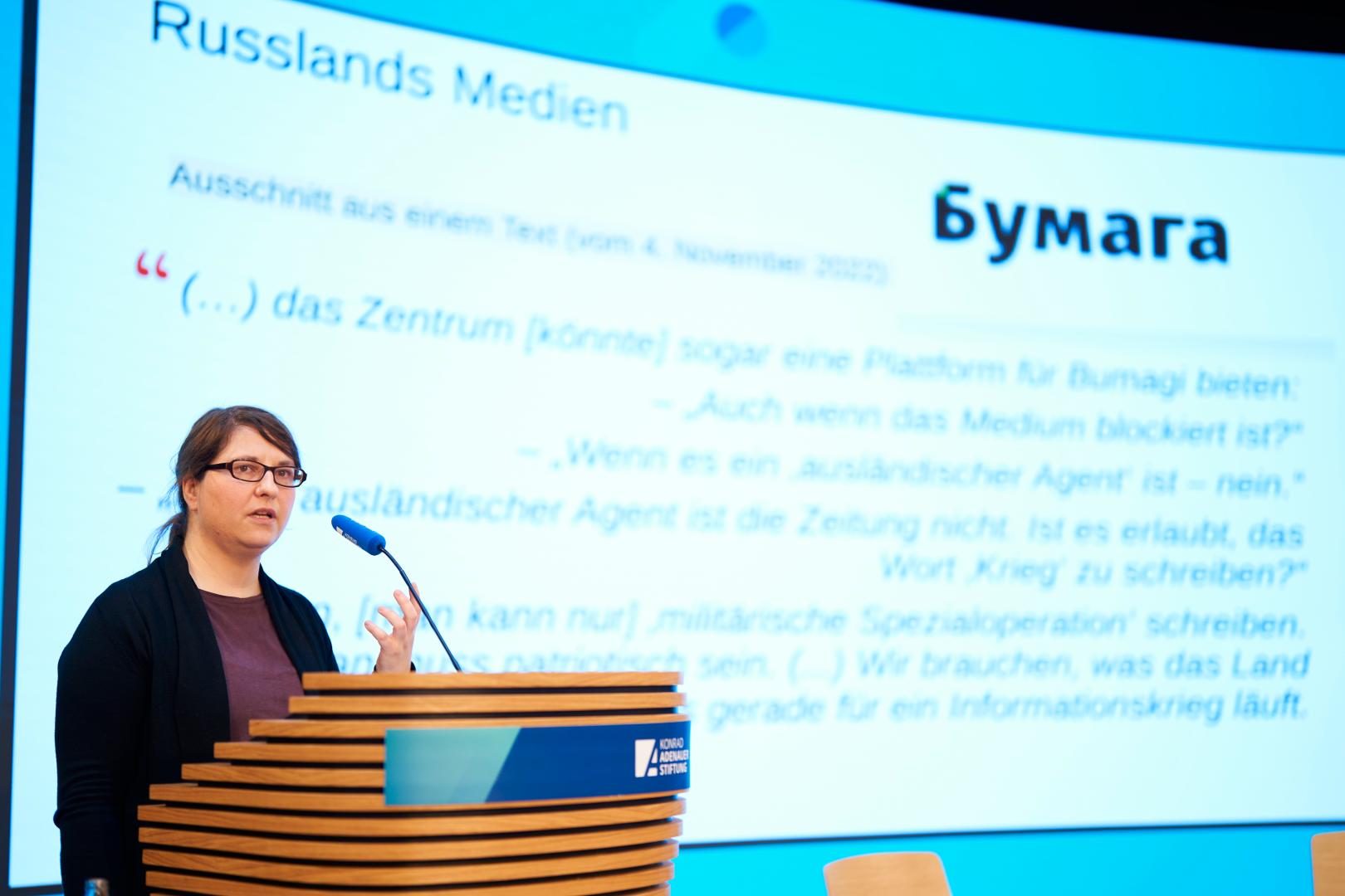 Doch was passiert, wenn Nachrichten und Informationen weder Faktenchecks unterzogen werden, noch eine freie, pluralistische Medienlandschaft existiert? Während Russland besonders aktiv Desinformationskampagnen in der Ukraine und westlichen Ländern organisiert, wird Kommunikation im eigenen Land strikt kontrolliert. Mandy Ganske-Zapf, Redakteurin bei Dekoder, berichtet auf der IKPK über die Mediennutzungsgewohnheiten der russischen Bevölkerung. Seit Beginn des Krieges in der Ukraine sei es nicht mehr möglich, sich über aktuelle Entwicklungen zu informieren. „Propaganda läuft 24/7 auf allen Kanälen.“
