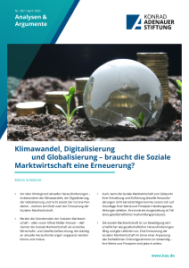 - Vor dem Hintergrund aktueller Herausforderungen – insbesondere des Klimawandels, der Digitalisierung, der Globalisierung und nicht zuletzt der Corona-Pandemie – mehren sich Rufe nach der Erneuerung der Sozialen Marktwirtschaft.