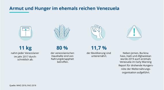 Die in Venezuela zurückgebliebenen Menschen kämpfen derweil täglich gegen Hunger und Mangel. Da der Lohn aufgrund der extremen Inflation so gut wie wertlos ist, können sie sich nicht ausreichend mit Nahrungsmitteln versorgen und sind auf spärlich bestückte Lebensmittelpakete der Regierung angewiesen. Laut Angaben der Welternährungsorganisation FAO litten in dem einst so reichen Land im Jahr 2019 über 20 Prozent der Bevölkerung an Unterernährung. Wurde Venezuela vor wenigen Jahren noch international für seine Armutsbekämpfung gelobt und erreichte globale Aufmerksamkeit durch die finanzielle Unterstützung von Sozialprogrammen in zahlreichen Ländern, fehlt es vielen Venezolanern heute am Nötigsten. Besonders betroffen sind vor allem die Kinder: Die unzureichende Versorgung prägt durch Mangelernährung im Mutterleib und im Baby- bzw. Kleinkindalter einen großen Prozentsatz der Heranwachsenden. Venezolanische Medien sprechen von der „Generation des Hungers“.