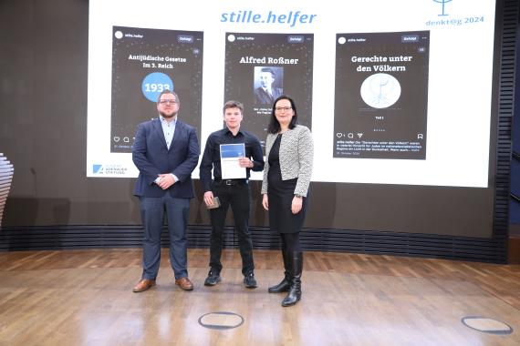 Den dritten Platz, prämiert mit 1.000 Euro, erreichten die Einzelteilnehmer Jakob März, Alexander Ilg und Jakob Bandel mit ihrem Projekt „Verdraengen.Schweigen.Gedenken“.