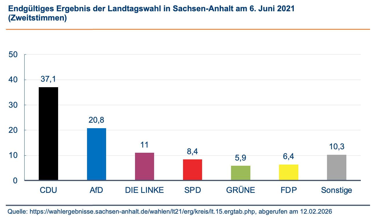 Sachsen-Anhalt ist für einen hohen Anteil an Wechselwählerinnen und Wechselwählern bekannt. Daran gemessen fallen die Veränderungen der Landtagswahl 2021 im Vergleich zu 2016 nicht ungewöhnlich hoch aus. Die CDU kann im Vergleich zu 2016 um 7,4 Prozentpunkte zulegen und wird mit 37,1 Prozent erneut stärkste Partei. Damit erzielt sie ihr drittbestes Ergebnis in Sachsen-Anhalt. Zweitstärkste Partei wird die AfD mit 20,8 Prozent (-3,4 Punkt). Die Linke verliert nach deutlichen Verlusten in 2016 diesmal 5,3 Punkte und erzielt mit 11,0 Prozent ihr historisch schlechtestes Ergebnis in Sachsen-Anhalt. Auch die SPD verliert erneut und fährt mit 8,4 Prozent ihr historisch schlechtestes Wahlergebnis im Land ein. Nachdem die FDP 2016 nur knapp an der Fünf-Prozent-Hürde scheiterte, schafft sie 2021 zum vierten Mal den Einzug in den Landtag von Sachsen-Anhalt. Die Grünen erzielen mit 5,9 Prozent (+0,8 Punkte) zwar ihr zweitbestes Ergebnis in Sachsen-Anhalt, sind aber die schwächste im Landtag vertretene Partei.