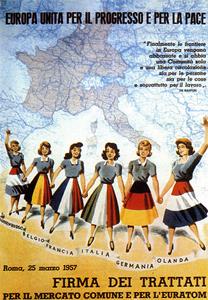 1965: Fusionsvertrag zur Einsetzung gemeinsamer Organe der Europäischen Wirtschaftsgemeinschaft, der Europäischen Atomgemeinschaft und der Europäischen Gemeinschaft für Kohle und Stahl (in Kraft getreten 1967). Im Bild zu sehen ist ein italienisches Werbeplakat für die Europäische Atomgemeinschaft.