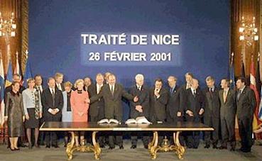 2000: Vertrag von Nizza (in Kraft getreten 2003): Reform der europäischen Institutionen, um den Beitritt von zehn weiteren Staaten zur Europäischen Union zu ermöglichen; Proklamation der Charta der Grundrechte der Unionsbürgerinnen und Unionsbürger; Erklärung zur Zukunft der Union, die die Frage der Rechtsverbindlichkeiten der Grundrechte innerhalb der Union prüfen soll sowie weitere Fragen der Fortentwicklung der EU.