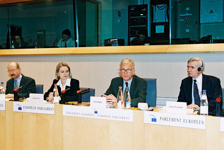 Treffen mit einer lettischen Delegation in Brüssel am 1. April 1999. Solveiga Silkalna, Hans Gert Pöttering, Romualdas Kalonaitas (v.l.). Communautés Européennes 1999
