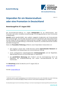 Die Konrad-Adenauer-Stiftung e.V. vergibt Vollstipendien für ein Masterstudium, eine Promotion oder einen mindestens dreisemestrigen Forschungsaufenthalt an einer Hochschule in Deutschland.