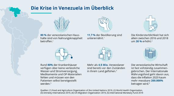 Medial wenig beachtet spielt sich im Norden des südamerikanischen Kontinents seit Jahren eine humanitäre Katastrophe ab, die laut Angaben der UN-Flüchtlingsorganisation UNHCR einen der größten Flüchtlingsströme des letzten Jahrzehnts ausgelöst hat. Hunger und Armut in Venezuela, dem erdölreichsten Land der Welt, haben seit 2015 rund 4,5 Millionen Menschen zur Flucht veranlasst. Nach UN-Schätzungen könnten bis Ende 2020 rund 6,5 Millionen Venezolaner ihr Land verlassen haben – fast ein Fünftel der Bevölkerung. Während die Nachbarstaaten bei der Aufnahme der Geflüchteten zunehmend an ihre Grenzen stoßen, leidet eine Vielzahl der in Venezuela verbliebenen Menschen Hunger und kämpft täglich ums Überleben.