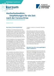 Das Wissenschaftsnetzwerk der Konrad-Adenauer-Stiftung, ein unabhängiges Expertengremium mit renommierten Fachleuten, hat 2019 ein Policy Paper Hochschulmedizin in Deutschland. Wandel – Herausforderungen – Handlungsbedarf erarbeitet, das vor dem Hintergrund der Corona-Krise neue Aktualität erhält. Die wichtigsten Empfehlungen sind in den folgenden Punkten skizziert: