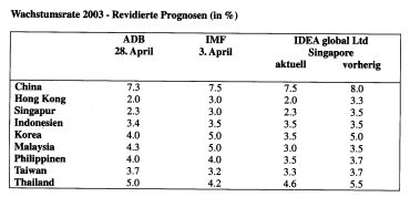 Eine schnelle Erholung von SARS ist essentiell für die Wirtschaften Asiens, die immer noch zu den am schnellsten wachsenden im Weltmaßstab gehören. Auch die Asiatische Entwicklungsbank hat ihre Prognosen revidiert und vorhergesagt, dass das Wirtschaftswachstum in Asien (ohne Japan) im Jahr 2002 von 5,7% auf 5,3% im Jahr 2003 zurückgehen wird (basierend auf einem Bericht des Asian Wall Street Journal vom 29.4.2003). Der langfristige wirtschaftliche Einfluß von SARS bleibt noch abzuwarten, da die internationale Gemeinschaft den von SARS betroffenen Ländern fernbleibt.