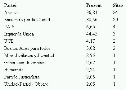 Damit hat die Alianza zwar ihre vorherige absolute Mehrheit verloren, die sie auch zusammen mit den vier Mandaten ihrer Wahlkoalition (UCD, Jubilados y Juventud und Generación Intermedia) nicht erreicht, so daß das Regieren in Buenos Aires schwerer werden wird als in der vergangenen Legislaturperiode.