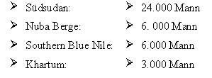- Es werden gemeinsame/integrierte Einheiten (Joint Integrated Units/JIUs) geschaffen. Sie werden zu gleichen Teilen aus Soldaten der SAF und der SPLA bestehen. Sie sollen die nationale Einheit und Souveränität symbolisieren und bilden den Kern der gemeinsamen sudanesischen Armee im Falle der Einheit. Sollte der Südsudan aber für seine Selbständigkeit optieren, werden sie in die bestehenden Teilarmeen integriert. Für die Zeit der Interimsperiode haben die JIUs folgende Stärken: