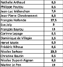 - Es überrascht nicht, daß 76% der Wähler von Jean-Luc Mélenchon (PG, Kommunisten) angeben, sie würden Hollande im 2. Wahlgang ihre Stimme geben. Nur 1% würden Nicolas Sarkozy wählen.
