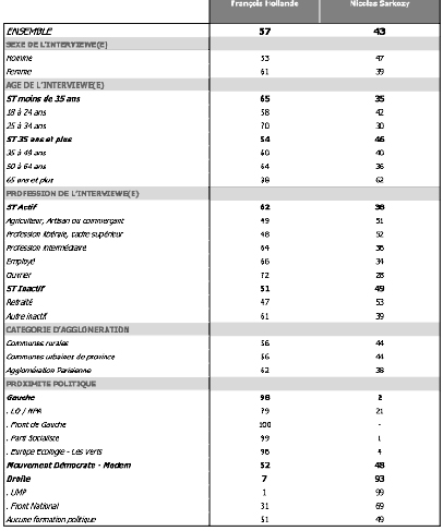 - Besonders interessant sind die Wahlabsichten der 2. Runde der Wähler von Bayrou: Sie würden zu 46% Hollande wählen und nur zu 32% Sarkozy. Nicolas Sarkozy kann also nicht darauf hoffen, mit Hilfe der Bayrou-Wähler die zweite Wahlrunde zu gewinnen. Schon bei der Präsidentenwahl 2007 hatte François Bayrou seinen Wählern keine Wahlempfehlung für den 2. Wahlgang gegeben.