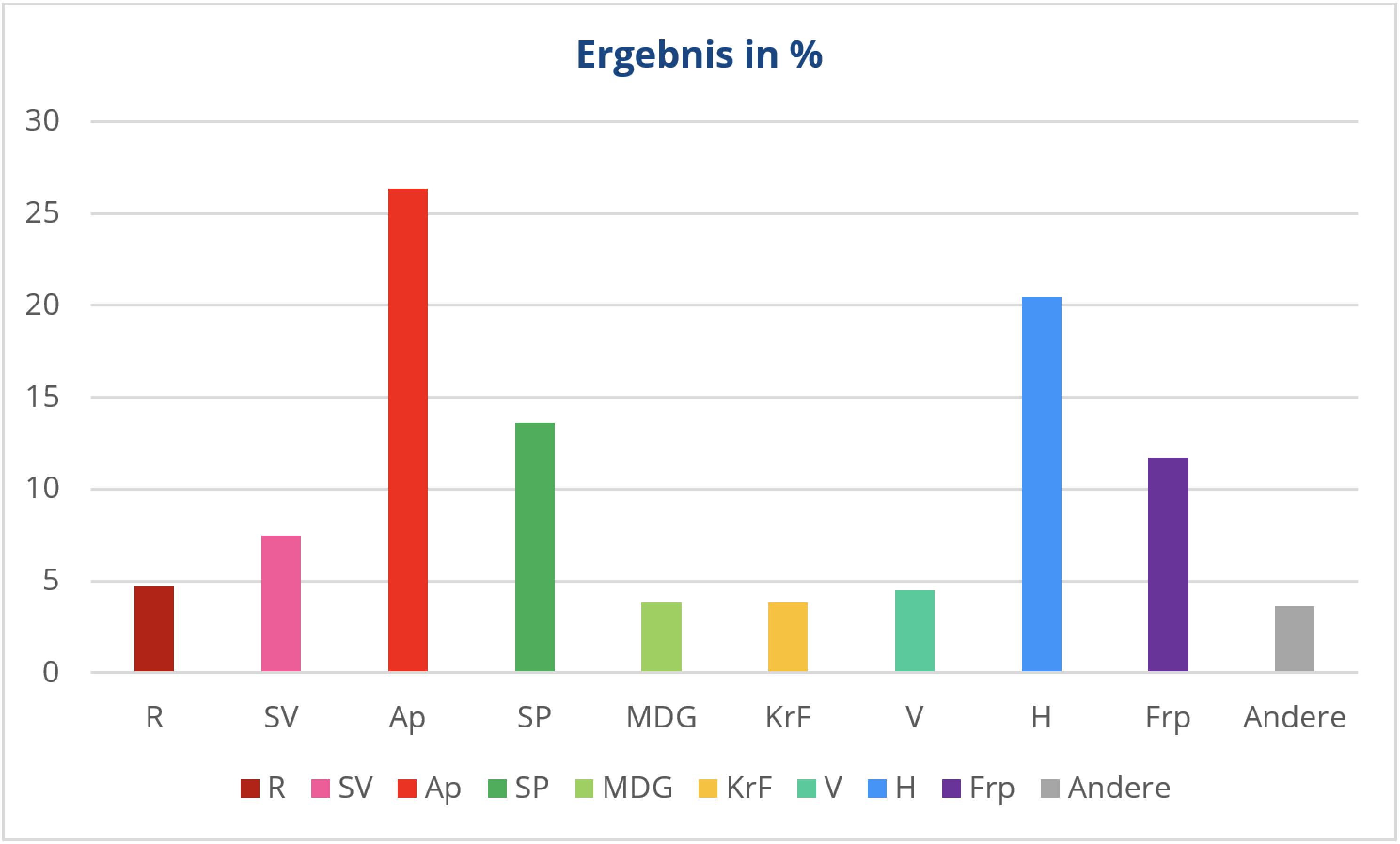 Die Sozialdemokraten erhielten zwar die meisten Stimmen bei dieser Wahl, erzielten aber insgesamt das schlechteste Ergebnis seit den 20iger Jahren des letzten Jahrhunderts. Høyre, ebenfalls eine Partei mit über 100-jähriger Geschichte, verlor nach zwei Legislaturperioden mit Ministerpräsidentin Erna Solberg an der Spitze 4,6% der Stimmen im Vergleich zur Wahl 2017. Ein Umstand, der zunächst dadurch zu erklären ist, dass es noch nie eine Partei in Norwegen geschafft hat, mehr als zweimal hintereinander die Regierung zu stellen. Obwohl die Regierung Solberg das Land gut durch die Krisen der letzten Jahre gesteuert hat und Norwegen mit einer negativen Übersterblichkeit in der Corona-Pandemie deutlich besser dastand als beispielsweise das Nachbarland Schweden, gab es in der Bevölkerung den Wunsch nach einem Wechsel und neuen Gesichtern an der Spitze.