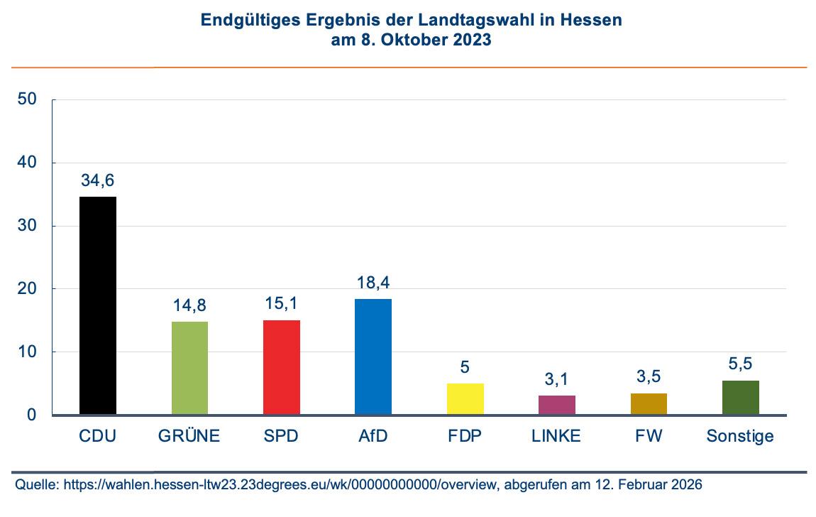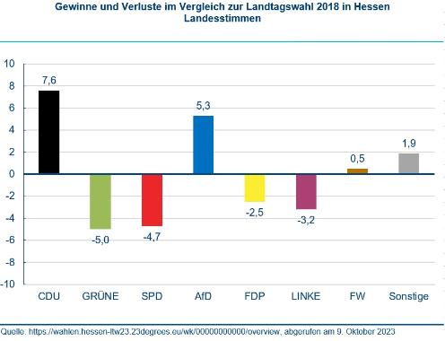 Die CDU gewinnt die Landtagswahl in Hessen. Die SPD erzielt ihr historisch schlechtestes Wahlergebnis. Grüne und FDP verlieren. Somit haben in Hessen wie in Bayern die Parteien der Regierungskoalition im Bund Verluste zu verzeichnen. Die AfD erzielt ihr bestes Ergebnis in einem westdeutschen Bundesland. Die Linke ist nach 15 Jahren nicht mehr im Parlament vertreten.
