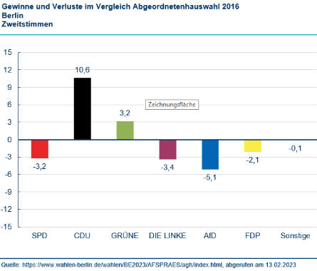 Die CDU gewinnt mit deutlichem Abstand zu den übrigen Parteien. Sie legt 10,2 Prozentpunkte gegenüber der Vorwahl von 2021 zu und erreicht 28,2 Prozent der Zweitstimmen. Die Parteien der Regierungskoalition aus SPD, Grünen und Linke verlieren. Die SPD hat zum dritten Mal in Folge ihr historisch schlechtestes Ergebnis in Berlin. Die FDP scheitert an der Fünf-Prozent-Hürde. Im Vergleich zu anderen Bundesländern wird die Wahl von besonders niedrigen Zufriedenheiten auf allen Ebenen geprägt.