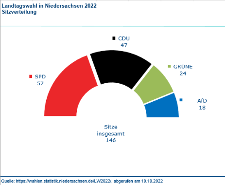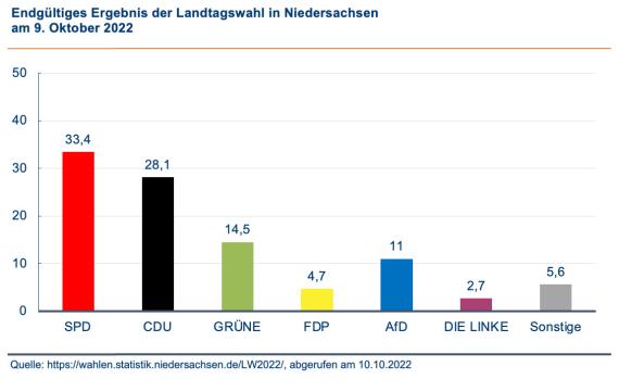 Die SPD wird bei der Landtagswahl in Niedersachsen stärkste Kraft und liegt mit 33,4 Prozent vor der CDU (28,1 Prozent). Grüne und AfD verbessern ihre Ergebnisse, während die FDP nach Verlusten nicht mehr in den Landtag einziehen wird. Damit verzeichnen zwei der drei Koalitionsparteien im Bund Verluste