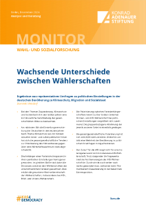 Die Konrad-Adenauer-Stiftung vermisst regelmäßig in repräsentativen Befragungen den politischen Raum anhand von Fragen zu Migration-, Klimaschutz- und Sozialstaatspräferenzen. Diese Studie liefert datengestützte Antworten auf die offenen Fragen. Die Ergebnisse leisten einen Beitrag zum Verständnis gesellschaftlicher Polarisierungstendenzen und zur Verortung der Wählerschaften im Vorfeld der Bundestagswahl 2025.