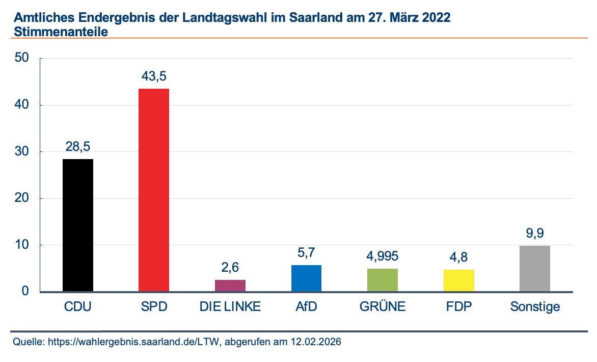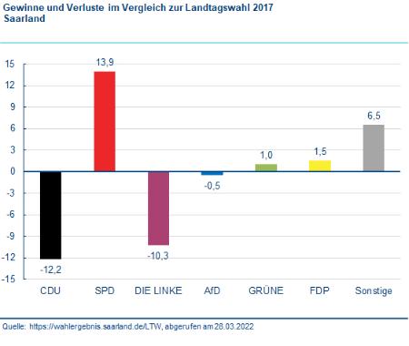 Die SPD wird seit zwei Jahrzehnten erstmals wieder vor der CDU stärkste Kraft mit absoluter Mehrheit. Mit 43,5 Prozent schließt sie an ihre guten Ergebnisse in den 1980er und 1990er Jahren im Saarland an. Die CDU erhält 28,5 Prozent der Stimmen und geht nach 22 Jahren in die Opposition. Die Linke verliert klar und ist nicht mehr im Landtag vertreten. FDP und Grüne scheitern ebenfalls knapp an der Fünf-Prozent-Hürde. Die AfD kam auf knappe 5,7 Prozent und zieht mit ähnlichem Ergebnis wie 2017 in den Landtag ein: Sie wird dort mit drei Abgeordneten vertreten sein. Auf die sonstigen Parteien entfallen insgesamt 9,9 Prozent. Die Wahlbeteiligung insgesamt liegt bei 61,4 Prozent und ist damit im Vergleich zur Vorwahl gesunken (‑8,3 Punkte).
