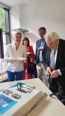 Prof. Dr. Bernhard Vogel, Andreas Kleine-Kraneburg, Marion Walsmann MdEP und Maja Eib beim Anschnitt der Geburtstagstorte zum 30- jährigen KAS Jubiläum