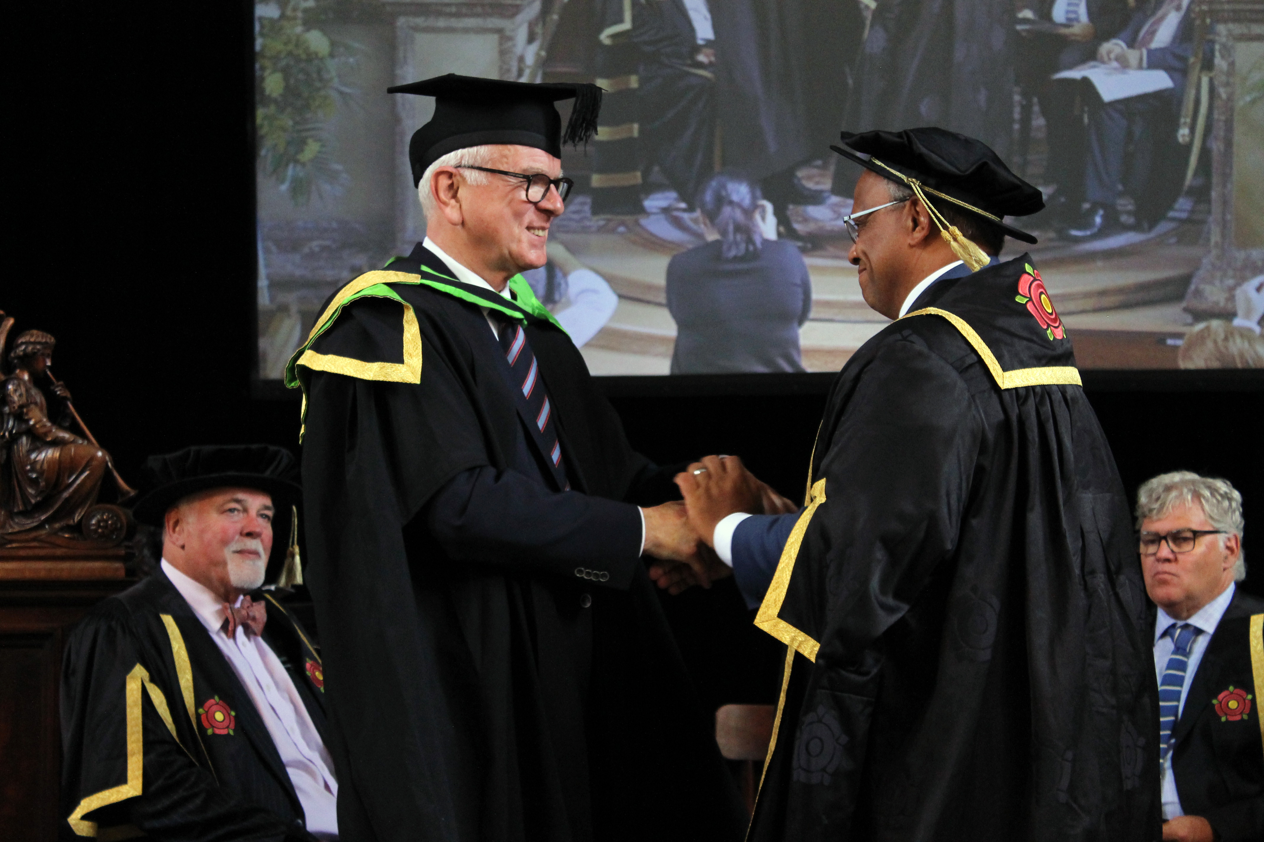 Lord Michael Hastings, Kanzler der Regent's University London, verleiht Dr. Hans-Gert Pöttering, Präsident des Europäischen Parlaments a. D. und Vorsitzender der Konrad-Adenauer-Stiftung, eine Ehrendoktorwürde für seine Verdienste um die europäische Einigung und die internationale Zusammenarbeit.