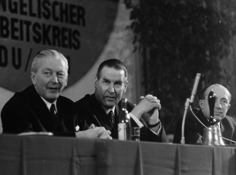 In den Jahren seiner Amtszeit als Bundesinnenminister verfestigte sich das Bild von Schröder, ein „Mann der Exekutive“ (Torsten Oppelland) zu sein, dem die Anbindung an die Fraktion und die Partei fehle. Auch der Evangelische Arbeitskreis der CDU/CSU, dessen Vorsitz er 1955 als Nachfolger von Robert Tillmanns übernahm und bis 1978 ausübte, stellte für ihn keine politische Hausmacht dar wie der Vorsitz der CDU-Sozialausschüsse für Hans Katzer oder der Vorsitz der Mittelstandsvereinigung für Kurt Schmücker. Als Vorsitzender des Evangelischen Arbeitskreises leistete er aber einen wichtigen Beitrag zur Integration des protestantischen Lagers in der Union. mehr >>