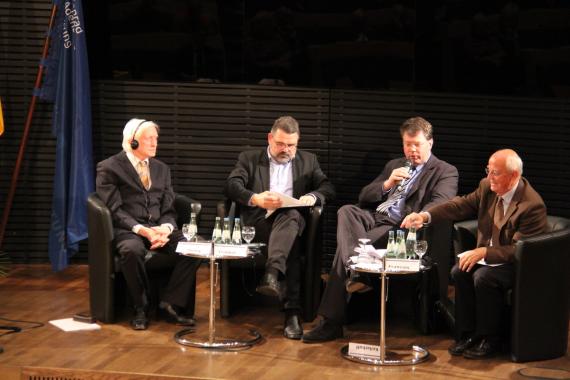 Es schloss sich eine von Sven-Felix Kellerhoff (DIE WELT) moderierte Diskussionsrunde an, an der neben Prof. Overy die Professoren Stefan Troebst (Leipzig) und Étienne François (Berlin) teilnahmen. Auch hier kam Skepsis gegenüber der „Machbarkeit“ einer gemeinsamen europäischen Erinnerungskultur zum Ausdruck. Plädiert wurde für eine größere Offenheit gegenüber anders akzentuierter Erinnerung. Notwendig sei im Sinne Dan Diners ein „Abgleich der nationalen Gedächtnisse“, ein „Teilen“ der Erinnerung im Sinne von „Mit-Teilen“.