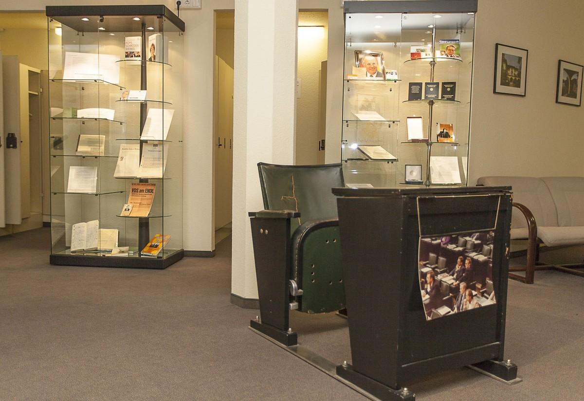Die zahlreichen Schriftstücke, Fotos und Objekte, die dem umfangreichen Personenbestand Gerd Langguth im ACDP entnommen wurden, können sein breit gefächertes Engagement und wichtige berufliche Stationen nur unvollständig dokumentieren: So spiegeln seine Dissertation sowie Urkunden zur Promotion und zur Ernennung zum Honorarprofessor Langguths universitäre Laufbahn wider. Flugblätter, Pressemitteilungen und -berichte zeigen seinen Einsatz als Bundesvorsitzender des RCDS in den Nachwehen der 1968er Bewegung. 1976 zieht Langguth mit 30 Jahren in den Deutschen Bundestag ein. Hierzu sind nicht nur Wahlprospekte und Abgeordnetenausweise, sondern auch sein Original-Abgeordnetensessel mit Pult aus dem Bonner Bundestag zu sehen. Als geschäftsführender Vorsitzender der Konrad-Adenauer-Stiftung setzt sich Langguth besonders für die Demokratisierung in Lateinamerika und nach dem Fall des Eisernen Vorhanges in Osteuropa ein. Für diesen Einsatz erhält er zahlreiche nationale und internationale Auszeichnungen. So sind neben seinem Bundesverdienstkreuz Orden aus Nicaragua und Venezuela ausgestellt. Adress- und Notizbücher, Mitglieds- und Presseausweise sowie Diplomaten- und Ministerpässe ergänzen die Sammlung. Für Langguths wissenschaftliche Forschungsschwerpunkte und sein breites publizistisches Wirken stehen Bücher zur 1968er Bewegung, zu den „Grünen“ und seine populären politischen Biographien u.a. zu Angela Merkel.
