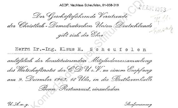 Am 9. Dezember 1963 wurde in Bonn der Wirtschaftsrat der CDU e.V. gegründet. Anlässlich des 50. Gründungstages soll hier der Aktenbestand des Wirtschaftsrates der CDU e.V., welcher sich im Archiv für Christlich-Demokratische Politik aufbewahrt wird, kurz vorgestellt werden.