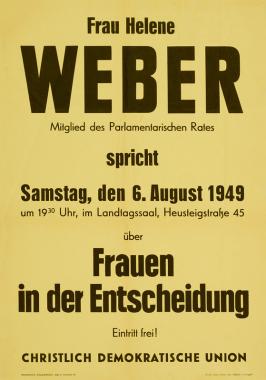 Am 23. Mai 1949 tritt das Grundgesetz für die drei westlichen Besatzungszonen in Kraft. Mit der ersten Wahl zum Deutschen Bundestag am 14. August 1949 zieht Helene Weber als Kandidatin des Wahlkreises „Aachen Stadt“ in den Deutschen Bundestag ein. Als Abgeordnete setzt sie sich für familienpolitische Belange und die Gleichberechtigung der Frau ein. Maßgeblich prägt sie die Entstehung und programmatische Ausrichtung des Bundesfrauenausschusses und der späteren Frauen-Union als Vorsitzende. Dabei ist es ihr stets ein Anliegen, mehr politische Ämter mit Frauen zu besetzen. Die Ernennung von Elisabeth Schwarzhaupt zur ersten Bundesministerin 1961 ist in gemeinsamer Arbeit mit anderen Unionsfrauen auch ihr Verdienst. Dafür hatte Weber sich schon Mitte der 1950er Jahre bei Adenauer eingesetzt.