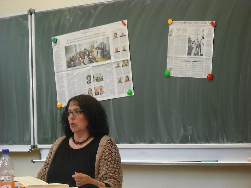 Im zweiten Abschnitt des Projekttages ging sie auf die 60’er und 70’er Jahre in der DDR ein. Hier ging sie auf die Kollektivierung der Gesellschaft ein und zeigte wie Begriffe wie Individualität in der DDR verdrängt wurden. Sie las aus ihren Büchern und sprach mit den Schülern über die Berichte aus dieser Zeit. Im Mittelpunkt standen besonders die Situation an den Schulen, was die heutigen Schüler besonders interessierte, aber auch die hohe Selbstmordrate in der DDR wurde besprochen und erklärt. Durch viele persönliche Erlebnisse zeigte Frau Klier den Schülern die Wirkung eines diktatorischen Systems und den Druck, den die Menschen damals empfanden.