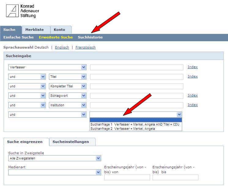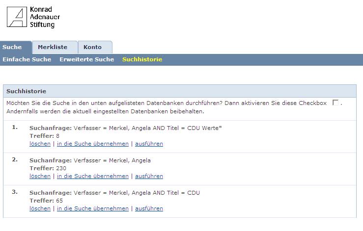 Ebenso wird ab der zweiten Recherche der Link Suchhistorie im Kopf des Benutzerkatalogs angeboten. Darüber können die Suchanfragen, die man zuvor durchgeführt hatte, mit dem Link ausführen erneut ausgelöst werden. Mit dem Link in die Suche übernehmen werden die betreffenden Suchbegriffe in die Suchmaske übernommen, damit weitere neue Suchbegriffe hinzugefügt werden können.